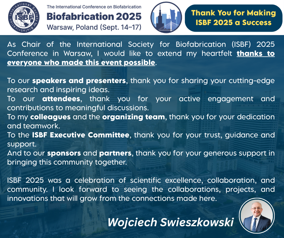 On behalf of the Organizing Committee, it is our great pleasure to welcome you to the 2025 International Conference on Biofabrication in Warsaw, Poland, from 14th to 17th September 2025.
